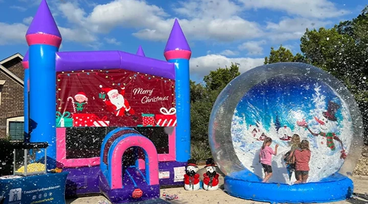 Make your party unforgettable with our customizable bounce houses & combos! Choose from Halloween, Thanksgiving, or Christmas themes at no additional cost.
